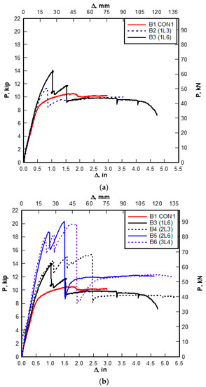 Load-deflection response for series 1: (a) the effect of increasing the CFRP area; (b) the effect of increasing the number of layers with the same area of CFRP.