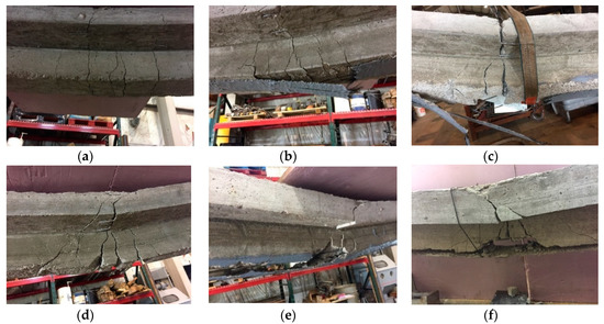 Crack patterns for series 1 beams: (a) CON1-B1; (b) 1L3-B2; (c) 1L6-B3; (d) 2L3-B4; (e) 2L6-B5; and (f) 3L4-B6.