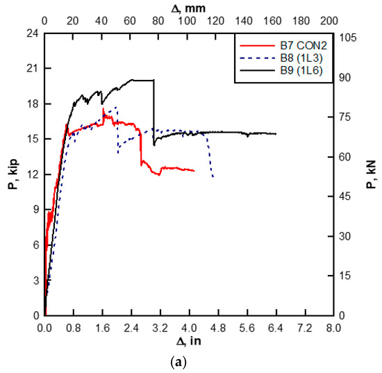 The load-deflection response for the tested beams of series 3 are shown in Figure 16. The behavior of all of the beams was very similar in the early stages of loading. After that, the stiffnesses of the strengthened beams were higher than the control beam (CON3). Several localized drops in the capacities of the CFRP-strengthened beams were recorded as the applied load increased towards complete failure, as shown in Figure 16.