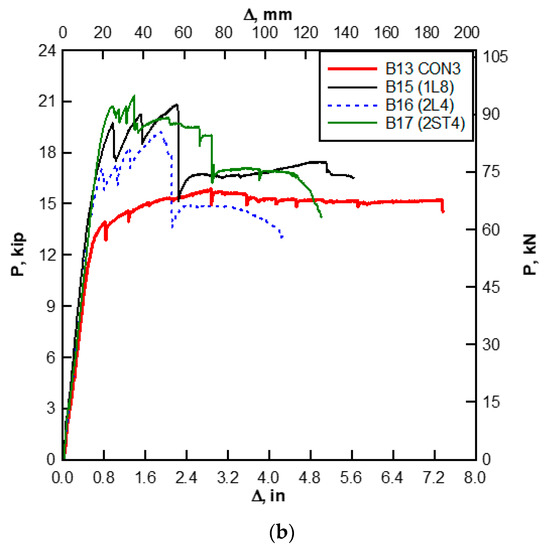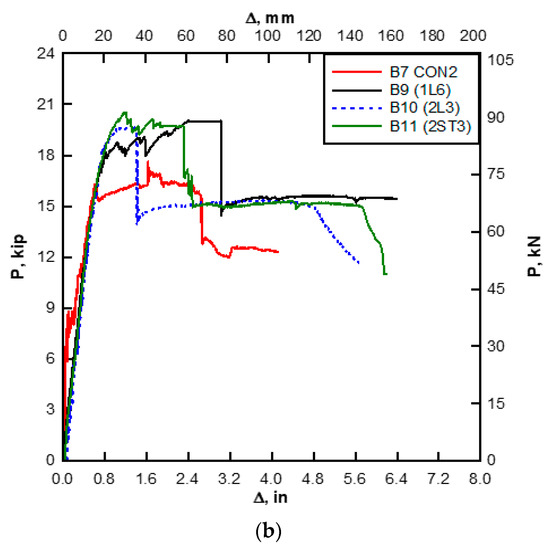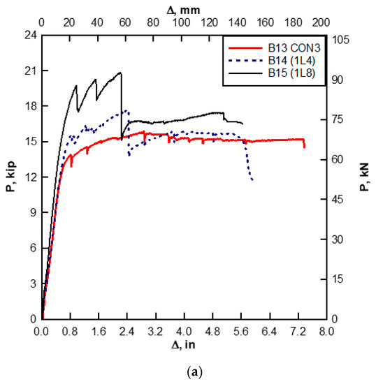 The load-deflection curves for the tested beams of series 2 are shown in Figure 13. Based on experimental observation, the load-carrying capacity of beams strengthened with a CFRP strip of 3 in (76.2 mm) width in a single layer did not enhance the ultimate capacity of the beam; however, the ductility was enhanced. However, when the strip width is increased to 6 in (152.4 mm), a 16% increase in strength was achieved. It was also observed that the strength of the beams strengthened with two layers of the same area enhanced the beam capacity by only 13% and the CFRP rupture happened earlier during the test, as seen in Figure 13. The results obtained experimentally demonstrate that applying CFRP as a single layer of a wide strip or multiple narrow strips results in better strengths than when applying CFRP in multiple layers, which is believed to be attribute to reducing the stress in the bond between the CFRP sheet and the concrete surface. The typical mode of failure for beams B8-B12 can be seen in Figure 14.