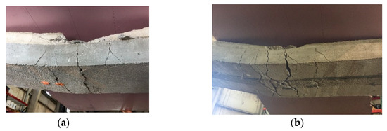 Three non-strengthened control beams, CON1, CON2 and CON3, were tested in this paper. Flexural failure controlled the failure mode of the control beams. Flexural cracks occurred at the midspan and extended to the compressive regions of the beams, as shown in Figure 8. Control beam CON1 failed in flexure in a ductile manner, whereas control beams CON2 and CON3 failed initially by cracking in the tension side (flange of the T-beam) in a ductile manner until the crushing of the compression concrete (web of the T-beam) occurred.