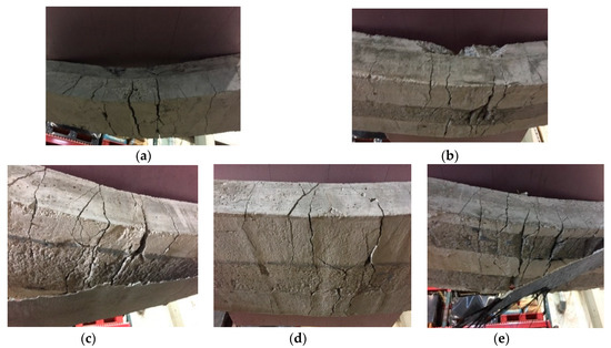 Crack patterns in the concrete flange for series 2 beams: (a) CON2-B7; (b) 1L3-B8; (c) 1L6-B9; (d) 2L3-B10; and (e) 2ST3-B11. All images show crack patterns on the bottom side of the concrete flange with the CFRP removed.