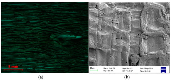 (a,b) Optical and SEM representation of treated linearly structured pawpaw fiber.