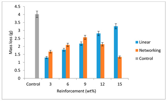 Variation of mass loss with wt% of reinforcement for the composites and the control sample.