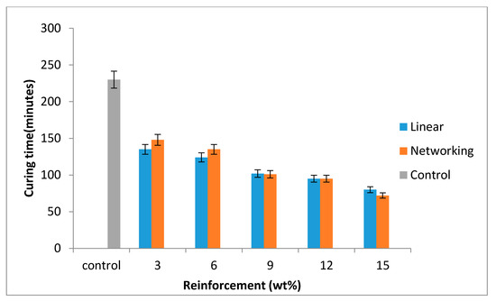 Variation of curing time (minutes) with wt% of reinforcement for the composites and the control sample.