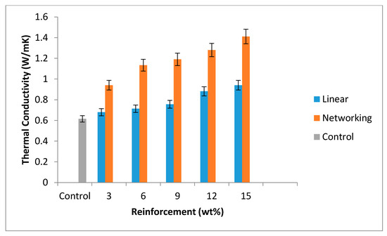 Thermal conductivity of polymer based materials is of great interest to electronic industries. Polymers are poor heat conductors due to the absence of free electrons for conduction mechanisms. The thermal insulating potential of polymers is rated by measuring the thermal conductivity. Polymers in general have low thermal conductivity since they have an isolated structure of individual chains. Discontinuities lead to phonon scattering that when even the backbone is thermally conductive, it is rather difficult to make the entire polymer a good thermal conductor. Epoxy was the major polymer being used for electronic applications and there is a need to improve on the electrical properties of the material. Thermal conductivity of developed composites and control sample results were shown in Figure 8. Low thermal conductivity of polymers is one of the major setbacks for its application in flexible electronics due to inadequate heat spreading capability. Therefore, developing biodegradable epoxy based composite for such an application is a good approach. The thermal conductivity of polymer is greatly influenced by its morphology; therefore, thermal conductivity of polymer based materials can be enriched by improving the alignment of polymer chains [26,27,28]. An investigation carried out on the relationship between the thermal conductivity of composite reinforced with LPF/GF and NPF/GF morphology, showed that the thermal conductivity of the samples increases as the weight percentage of reinforcement increases for all samples. However, thermal conductivity was highly enhanced by network pawpaw fiber than linear pawpaw fiber, which also corroborates the submission that morphology has great influence on thermal conductivity of polymer materials. As it can be seen from the results, the thermal conductivity of the composite samples with network PF/GF was enhanced more than linear PF/GF due to the differences in their morphologies. While the thermal conductivity of epoxy was 0.62 W/mK, the thermal conductivity of the best sample from the network pawpaw fiber/glass fiber hybrid composite from 15 wt% reinforcement was 1.41 W/mk. The observed enhanced conductivity in network structure based composites (Figure 8) was due to the network nature of the fiber as shown in Figure 4a. The interconnectivity that exists in the network structure might likely encourage easy heat flow within the materials compared to the linear structure in Figure 5a. These values were in close range with the thermal conductivities of concrete mixed with recycled HDPE, LDPE, PP, and PET, which have thermal conductivities of about 0.74–0.96, 0.72–0.86, 0.84–0.94 and 0.95–1.02 W/(mK), respectively [29].