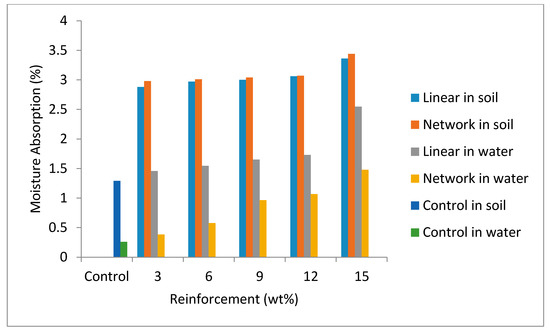 The effect of moisture absorption on the materials is essential in order to know how the developed composites will respond when they come in contact with water directly or in a soil environment. Figure 9 shows the various responses from these environments. The moisture absorption in soil was high compared to that of water. This may be due to many factors, such as the residence time, temperature variation, and the presence of micro-organisms in the soil. More absorption indicates a higher potential for degradation. Therefore, degradation is highly promoted in the soil environment than in the water environment due to the harsh environmental conditions of the soil. This revealed that polymer composites for underground applications should be highly protected against degradation due to the prevailing activities that such materials may likely encounter in service. The effects of the fiber structure and weight fractions were not well pronounced in the soil environment since the differences in the values were marginal in all weight fractions. However, in the water environment, the reverse was the case: linear pawpaw fiber/glass fiber hybrid reinforced composites absorbed more water than network pawpaw fiber/glass fiber hybrid reinforced composites. Furthermore, there is a substantial increase in the moisture content with increase in weight fraction and immersion time. The moisture content of the control sample in both media was low compared to the developed composites. The moisture absorption of the control was 0.26% after 144 h in water and 1.29% after three months in soil. This observation was due to the hydrophobic nature of the polymer as stated by previous researchers [30,31]. This, however, showed that biodegradable materials need to be added to polymers in order for them to be able to degrade after use. Nowadays, the attention of researchers worldwide is on how to ensure a proper disposal of used polymer products [32,33,34]. Therefore, there is a need to synergize between the required properties and the disposal mode for the sake of the environment.