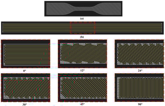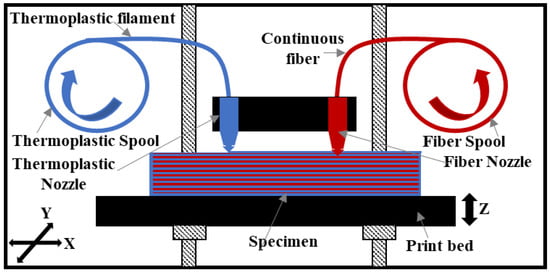 Two sets of 3D-printed specimens reinforced with glass fibers were produced. The first set, ‘single-angled 3D-printed GFRP composite’, consisted of GFRP specimens 3D-printed at each discrete fiber orientation of 0°, 12°, 24°, 30°, 45°, and 90° following ASTM D3039 test standards [32]. The single-angled composites were 3D-printed with a 140-mm gauge length and 15-mm width as 10-layer symmetric balanced layers, i.e., eight layers of glass fiber and two layers of thermoplastic as floor and roof of the composite. The symmetrically balanced layup is utilized to eliminate in-plane and out-of-plane coupling and eliminate in-plane tension-shear coupling during tensile testing [33]. The second set, ‘multi-angled 3-D printed GFRP composites’, consisted of GFRP tension test specimens 3D-printed with a stacking sequence of multiple fiber orientations and thicknesses. The multi-angled composites were 3D-printed with a 140-mm gauge length and a 15-mm width as 23 layers of glass fiber and two layers of thermoplastic as floor and roof of the composites. The printing process is illustrated in Figure 1.