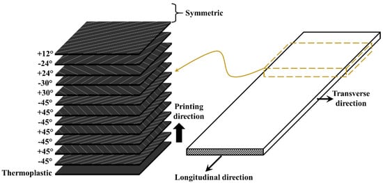 The printer operates at a fixed layer height of 0.1 mm for fiber-reinforced parts. Therefore, for the single-angled 3D-printed GFRP composites (Set 1), the thickness rounds up to 1 mm, and for the multi-angled 3D-printed GFRP composites (Set 2), the thickness rounds up to 2.5 mm. The layup of single-angled 3D-printed GFRP composites (Set 1) is shown in Table 1.