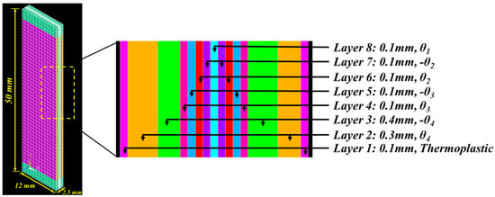 In order to capture a complete failure of composite laminas, birth and death features in APDL were utilized. In this approach, the displacement was applied in small increments, and all the elements were evaluated against a maximum stress failure criterion. Any element that meets the failure criterion was considered as a dead element, and its contribution to the FE simulation was minimized by reducing the stiffness by a factor of 10−6. The stress and failure criterion in all neighboring elements were checked to ensure they did not reach the failure stress level. The updated status for all elements was fed to the following displacement increment. In the finite element model, a small displacement increment of 0.012 mm was utilized by specifying a displacement step of 0.06 mm and five sub-steps for every displacement step. The specified small displacement increments were necessary to ensure that failure of an element is evaluated very frequently. Moreover, overestimation of the failure stress and ductility was minimized. In addition, a maximum of 1000 iterations were specified for every displacement increment to minimize numerical error for predicting nodal forces and deformations. To simulate the tensile tests, a vertical displacement was applied on the top surface extremity of the finite element model, and the opposite extremity at the bottom surface was restrained in all directions. To avoid early failure at ends due to stress singularity at displacement constrains, 3-mm long end regions were modeled as failure-free zones. The FE model was divided through thicknesses into multiple layers. One SOLID45 element was considered for each layer through thickness. Each layer was assigned a specific thickness and fiber orientation, θ. A perfect bond was assumed between adjacent layers. The geometry of the FE model and the multiple layers with respective thickness for the laminated composites are shown in Figure 4.