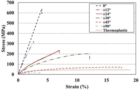 where is the displacement, is the strain reading from extensometer, is the gauge length measured, is the force at specific displacement in the single-angled composite, is the stress at the specific displacement, is the force at specific displacement in the thermoplastic specimen, is the new force evaluation after eliminating the thermoplastic contribution, and is the new stress calculated with the new area by eliminating the two thermoplastic layers.