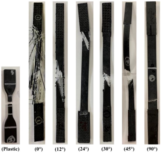 Failure modes of the GFRP specimens were described per ASTM D3039 [32] as explosive failure in the gauge area in the middle location (XGM) for 0° fiber orientation specimens, which represented typical broom-like failure due to the weak interfacial bond between glass fibers and the thermoplastic matrix [41,42]. Lateral failure in the gauge area in the middle location (LGM) was observed for 45° fiber orientation specimens showing fiber rupture in multiple superimposed ±45° angled planes. The increasing ductility of 45° fiber orientation specimens can be explained by the homogeneous share of the applied tensile load between the fibers and the matrix. The thermoplastic layer seemed to be peeling off, which indicates fiber-matrix interface debonding. Conical structures and pockets in the middle portion showed evidence of accumulation of damage in the center and consequent crack formation by pulling out the fibers [39]. Lateral failure in the gauge area in the bottom location (LGB) for 90° fiber orientation showed a straight rupture edge pulling out of the transverse fibers through the cross-section of the specimen. Finally, angled failure in the gauge area in the middle location (AGM) was observed in the specimen with 12° fiber orientation. Minor broom-like failure was observed, which indicated a limited degree of fiber-matrix interface debonding before fiber fracture occurs. Fiber rupture was observed with angled failure in the gauge area in the top location (AGT) for 24° fiber orientation and AGM was observed for 30° fiber orientation. Figure 6 presents the failure modes of the 3D-printed thermoplastic specimens and all the single-angled 3D-printed GFRP composite specimens (Set 1).