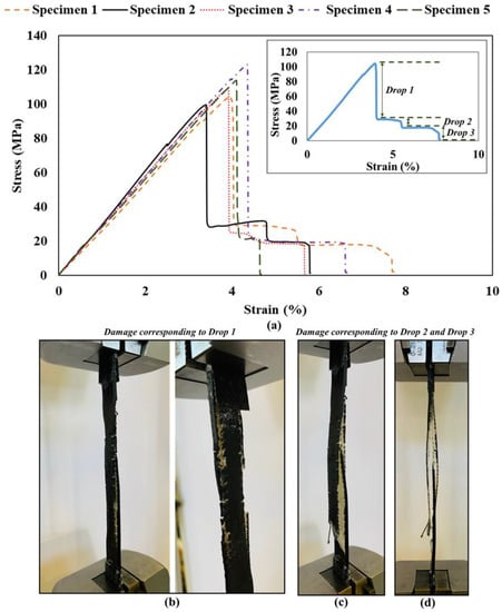 The stress-strain behavior and failure modes of the multi-angled 3D-printed GFRP composite specimens (Set 2) are shown in Figure 7. Three distinct drops can be observed, and the damage corresponding to every stress drop is illustrated in Figure 7a,b. At drop 1, a considerable loss in capacity was observed in the specimen with partial damage at the top and middle locations of the specimens. The sudden loss in capacity at the first drop could be attributed to the high strain rate effect in load transfer between layers, which results in multiple layers failing together rather than failing sequentially. At drop 2, excessive damage occurred, which led to drop 3 where complete specimen failure was observed. It is evident from Figure 7 that the behavior of the multi-angled 3D-printed GFRP composite differs from the single-angled 3D-printed GFRP composite. In particular, the strength and strains at the failure of discrete fiber orientations are different when tested individually than when tested in a composite with other fibers at other discrete angles. The multi-angled 3D-printed GFRP composite does not achieve high strength and high stiffness when compared to traditional GFRP composites. It is the goal of this study to show the possibility of achieving pseudo-ductility in 3D-printed FRP composites and lead the way to future directions for improvements in strength and stiffness. A summary of the results of the multi-angled 3D-printed GFRP composite specimens (Set 2) is presented in Table 5. The stress-strain behavior and failure modes of the multi-angled 3D-printed GFRP composite specimens (Set 2) are shown in Figure 7.