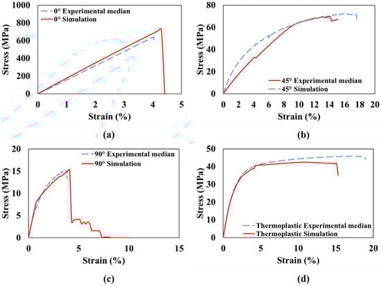 To validate the FE model, the simulation results for the 0°, 90°, and 45° single-angled 3D-printed GFRP composite specimens and thermoplastic specimens were compared to their experimental results, as shown in Figure 8.