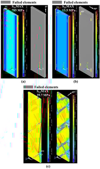 Failure modes of the finite element model simulations of single-angled 3D-printed GFRP specimens with (a) 0°, (b) 90°, and (c) 45° fiber orientations.