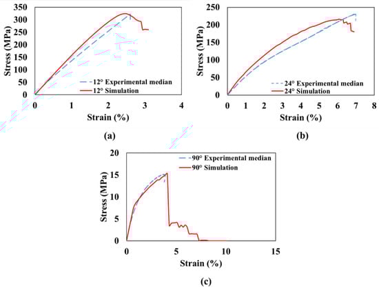 Comparison of stress-strain curves from the experiment and simulation for single-angled 3D-printed GFRP composite with (a) ±12°, (b) ±24°, and (c) ±30°.