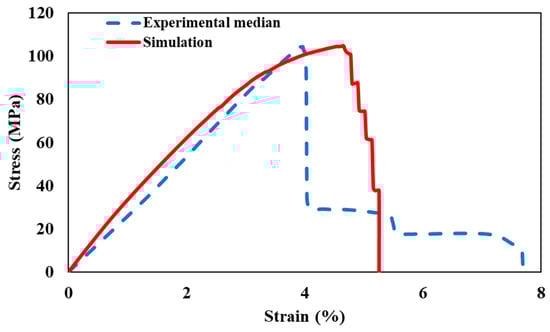The multi-angled 3D-printed GFRP composite model was developed with the thickness and fiber orientations as presented earlier in Figure 4 with θ1 = 12°, θ2 = 24°, θ3 = 30°, and θ4 = 45°. The stress-strain curves obtained from the simulation and the experiment of the multi-angled 3D-printed GFRP composite are shown in Figure 11. It is evident that, prior to the peak, the behavior of multi-angled 3D-printed GFRP composite is similar in both simulation and experimental testing. The elastic modulus and the ultimate strength of the multi-angled 3D-printed GFRP composite model are fairly similar to the experimental observation. This shows that the load share between the layers of the discrete fiber orientations meets the load share assumed in designing the composite. Therefore, the concept of load share used in this study for design works well in the linear elastic range.