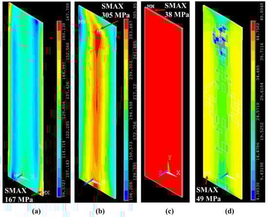 Similarly, for the thermoplastic layer, non-uniform stress contours were observed in a multi-angled composite with failure observed in some elements. However, in the single-angled composite, uniform stress was observed in the thermoplastic layer. The strain at failure for the thermoplastic layer reached 15% based on the FE model result shown in Figure 5. However, in the multi-angled composite, failure initiation is captured as early as 3.3%, as demonstrated in Figure 12d. The difference in stress contours for the thermoplastic layer between single-angled and multi-angled composites could be attributed to the difference in the adjacent layers. In the case of a single-angled composite, all layers were thermoplastic and behaved similarly under uniaxial load. On the other hand, in the case of a multi-angled composite, the adjacent layers were fiberglass with fibers oriented at 45°, which behave differently under a uniaxial load. The mismatch in deformations between the two layers (i.e., thermoplastic layer and its adjacent layer) due to layer orthotropy and fiber orientation results in developing interlaminar stresses, which impose additional non-uniform stresses on the two layers. This causes the thermoplastic layer to fail at a relatively low strain level. Understanding interlaminar stresses could explain the excessive delamination observed in the multi-angled composite and explains why the experiment showed a sudden drop in capacity at lower strain compared with the FE model. This observation suggests that a ductile behavior could be obtained experimentally if interlaminar strength between layers was engineered to enable separate failure for layers that have different fiber orientations. Stress contours are shown in Figure 12.