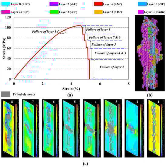 Detailed analysis of the failed elements and layers attributed to the progressive drops in the stress-strain curve of the multi-angled 3D-printed GFRP composite is performed and presented. A complete overview of the failure is shown in Figure 13. The stress contours of the different layers are shown in Figure 13c. In these contours, the grey color represents failed elements at the corresponding drops illustrated in Figure 13a. The polymer layer observed complete failure at a 3.8% strain with a negligible drop in capacity. At about 4.75% strain, about one-third of the elements in layer 8 with 12° fiber orientation failed to lead to the second drop in capacity, which occurred after the peak load. Extensive failures of layer 7 with −24° fiber orientation and layer 6 with +24° fiber orientation occurred at about 4.92% strain, which results in the third drop in capacity. Layer 5 with −30° fiber orientation observed failure of some elements at the 5.00% strain, which causes the fourth drop. Combined failure for elements in layer 4 with +30° fiber orientation and layer 3 with −45° fiber orientation occurred at 5.16% strain, which results in the fifth drop. Finally, considerable failure in layer 2 with +45° fiber orientation took place at 5.26% strain, which leads to the last drop in capacity and concluding failure of the entire composite. Figure 13b shows a complete set of failed elements in specific layers corresponding to that of the fiber orientation. The failure of layers with different fiber orientations was successive due to the assumed perfect bond and ideal load transfer between layers. Considering delamination in modeling could disturb load transfer between layers and, therefore, could lead to a separation between the load drops, as observed experimentally.