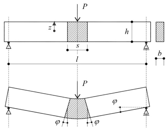 For the definition of the beam length, it is necessary to set the type of loading scheme, which can either be on three-points (L = 500 mm in accordance with the [22,23,24]) or four-points (L = 450 mm in accordance with the [25,26]). Then, the moment distribution can be easily determined.