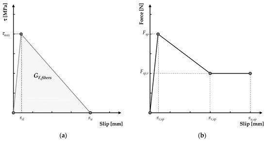 - the distributed bond throughout the lateral surface of the fiber, which is modelled through a bilinear bond-slip law (Figure 6a) which is defined by the three parameters τmax, sel and su and is governed by the fiber fracture energy (GF,fiber);