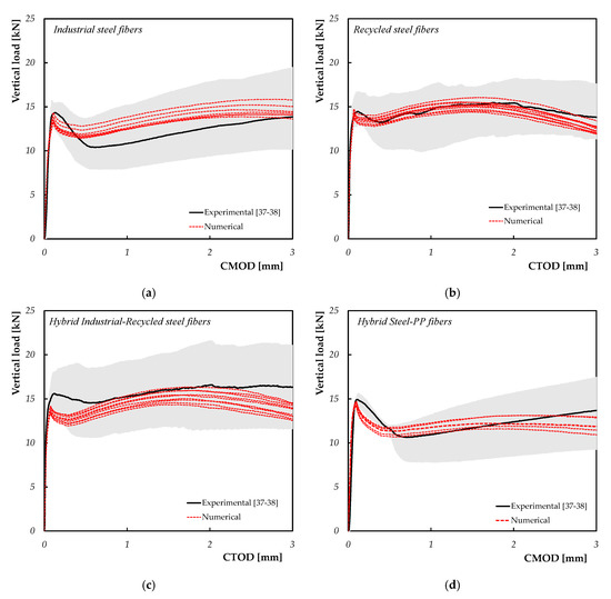 Figure 7 shows some representative comparisons between experimental and numerical curves. The black lines represent the average experimental curve and the gray area its scatter. On the other hand, the red curves represent the curves obtained by the numeral simulations (10 simulations for each case): the scatter of the numerical curves is due to the fact that, for each simulation, a random distribution of the fibers is generated and, consequently, the number of fibers crossing the cracked section is variable.