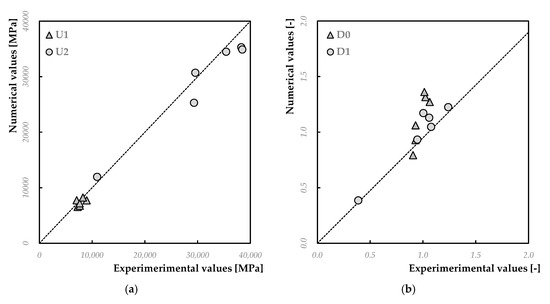 On the other hand, as a general trend the numerical simulations tend to overestimate (of around 20–25%) the D0 experimental values (Figure 8a). This difference is attributable to the underestimation of the first crack resistance flf (see for example Figure 7c), as D0 is strictly related to the latter. Conversely, the simulated ductility index D1 are closer to the corresponding experimental results (Figure 8b) and the scatter is often lower than 1–2%.