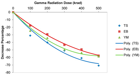 The effect of gamma radiation on the mechanical properties—i.e., tensile strength (TS), elongation at break percentage (Eb%), and Young’s modulus (Y)—of jute fabrics was monitored (all the average values were calculated from three tests). All the dependencies in this paper are described as a polynomial curve of 2nd order. It is clear from Figure 2 that, with the increase in the gamma dose, all the mechanical properties decreased significantly. The TS of the jute fabric decreased about 70% when treated with 500 krad compared to the untreated fabric. Similarly, the Eb% and Y also decreased 57% and 58%, respectively, when treated with a similar dose of 500 krad compared to the untreated fabric. This decreasing trend for all the mechanical properties—i.e., TS, Eb%, and Y—of jute fabric is due to the penetration of a very strong ionizing radiation such as gamma radiation into the fiber, which leads to breaking the primary bonds of the cellulose structure, which may change the middle lamella and, consequently, reduce the ultimate cells of the fibers [40]. This severe destruction of the fibers may responsible for the decreasing of all the mechanical properties of the jute fabrics. Even the elongation properties were decreased with the decrease in the modulus. Though this is an irregular behavior for a material, this may happen due to the heavy breakage of the polymeric structure that turned it into tiny molecules and caused it to lose its main physical state. Additionally, it made the material more amorphous and brittle, and hence caused it to break immediately under a tensile load without much extension.