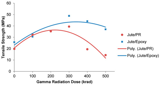 However, further increasing from the dose of 300 krad leads to a decrease in the TS. It was found that, at a dose of 500 krad of gamma radiation, the TS decreased 63% from the maximum TS for the Jute/PR composite, which is even 27% lower than the non-irradiated composite. Similarly, the TS of the Jute/Epoxy composite decreased 24% at a dose of 500 krad. This opposite trend after a certain level of gamma radiation dose is due to two opposing phenomena—namely, the photo cross-linking and photo degradation that take place simultaneously under gamma radiation. At lower doses, free radicals are stabilized by a combination reaction and results in photo cross-linking among the molecules, which increases the TS. Inversely, at a higher dose, the backbone of the chain may lead to break. Consequently, the polymers are degraded into small fragments, and this results in a decrease in the tensile properties [34,40]. Severe degradation of polymer molecules may also occur at high dose such as 500 krad, and results in the lowest TS, even lower than that of the non-irradiated composites. Though both the composites behave quite similarly after the gamma radiation, there is a little influence on the matrix as well. Polyester resin affects the TS more than the epoxy resin after gamma radiation, as it increased the TS up to 98%, whereas in epoxy it was 89%. However, the PR composite is less stable in gamma radiation, as it decreased the TS more quickly during the gamma radiation dose than the epoxy composite.