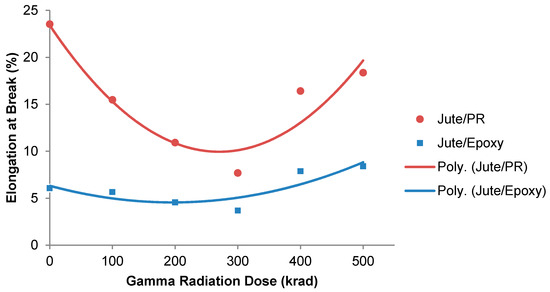 The effect of gamma radiation on the elongation properties of the composites are revealed in Figure 4. The curves clearly indicate that the elongation at break percentage (Eb%) gradually decreased with the increase in the gamma radiation dose up to a certain level of 300 krad, then started to increase continuously. At a dose of 300 krad of gamma radiation, the Eb% decreased from the maximum to 7.68 from the Eb% of the non-irradiated composite of 23.53 for the Jute/PR composite, and the Eb% decreased to 3.68 at a dose of 300 krad from the 6.06 Eb% of the non-irradiated Jute/Epoxy composite. Elongation is a totally opposite property to tensile strength. The decreasing trend of Eb% with the increase in gamma radiation is due to the opposite phenomenon to TS. As discussed above, gamma radiation increases the bonding among the fibers and matrix, making them highly oriented structures; this may lead to the highest amount of crosslinking being formed between the polyester-polyester and jute-polyester molecules for the Jute/PR composites, and the epoxy-epoxy and jute-epoxy molecules for the Jute/Epoxy composites [28]. This higher crosslinking among the molecules may lead to a higher crystallinity and thus restrict the segmental motion of the polymer chains, making the composite break at a lower percentage of elongation [42].