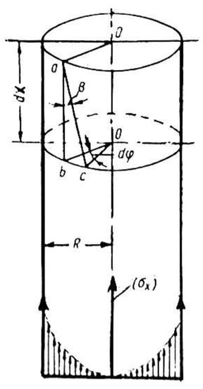 As the yarn is passed on, each individual fiber in the yarn is twisted through an angle around the axis of the yarn. The fiber ab with the length dx, which is parallel to the yarn axis in the yarn before twisting, tilts by an angle of β and rotates by an angle of dφ around the yarn axis.
