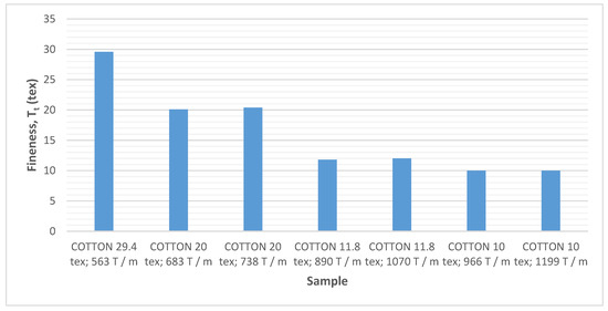 The yarn fineness was determined directly and gravimetrically based on ISO 2060 (Textiles—Yarn from packages—Determination of linear density (mass per unit length, 1996)) by the skein method [14] (Table 5, Figure 3).