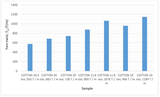 With the presented investigations, we wanted to find the optimum equation for determining yarn twist. We used two equations, Koechlin’s and Laetsch’s equations, to calculate the number of turns per meter in the yarn. The equations differ in their twist exponents. Koechlin’s equation is used to calculate the twist with the metric measuring system, while Laetsch’s equation is used to calculate the twist using the English measuring system. The twist coefficient, αe, was determined in a spinning mill for ring-spun yarn made of long staple cotton fibers with a length of 25 to 60 mm, taking into account that the analyzed samples were produced on a laboratory spinning machine spinning tester (SERMSTES), which allows the production of ring-spun yarns with a fineness between 10 and 30 tex and a twist count between 500 and 1200 turns per meter. Given the fineness and the number of twists per meter of the analyzed yarn that can be spun on the spinning tester, they determined the optimum twist coefficient, αe, in the spinning mill before spinning.