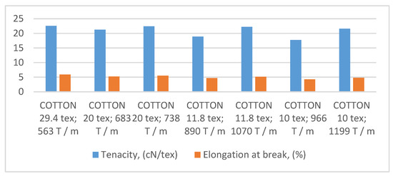 Tensile properties, such as tenacity and elongation at break of a single yarn, were measured on the tensile testing machine Statimat, based on ISO 2062 (Textiles. Yarns from windings. Determination of breaking force and breaking elongation on devices with constant expansion rate (CRE), 2009) [16]. We took ten measurements from each cop, so we performed 50 measurements altogether. Table 7 gives the results of the measurements for single yarns of different fineness and number of turns per meter; for each measured cop, the average value of ten measurements is given. Figure 5 presents the average tenacity and elongation at break of samples analyzed.
