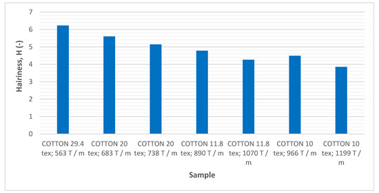 From the given results of the hairiness (Figure 9), it can be concluded that the hairiness of yarn is not directly influenced by the fineness of the yarn, but only by the number of turns per meter, which depends on the fineness of the yarn. Figure 9 shows that the hairiness of yarn decreases as the number of turns per meter in the yarn increases. However, since the optimum number of turns per meter in the yarn is determined for a given yarn count, it is a fact that coarser yarns are also hairier than finer yarns, as coarser yarns cannot obtain as many turns per meter.