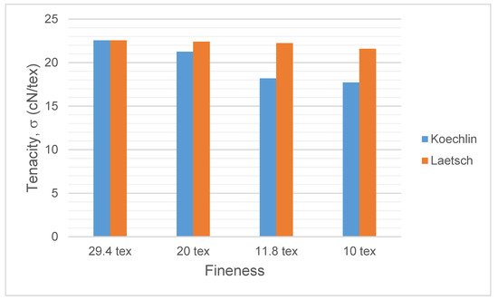 The results of measuring tenacity show that tenacity decreases with the decreasing fineness and twist of yarns (see Figure 3). For yarns where the twist was calculated according to Koechlin’s equation, the decrease in tenacity was higher.