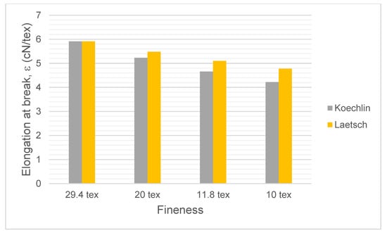 The results of the elongation at break showed that the elongation at break also decreased with decreasing fineness and twist of the yarns. The decrease in elongation at break was higher for yarns for which the twist was calculated according to the Koechlin equation (see Figure 9).