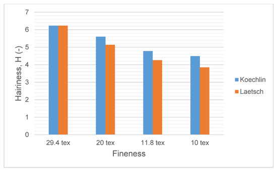 The yarn hairiness showed exactly the opposite in the results for tenacity and elongation, i.e., the hairiness of the analyzed yarns was lower for yarns where the twist was calculated according to the Laetsch’s equation.