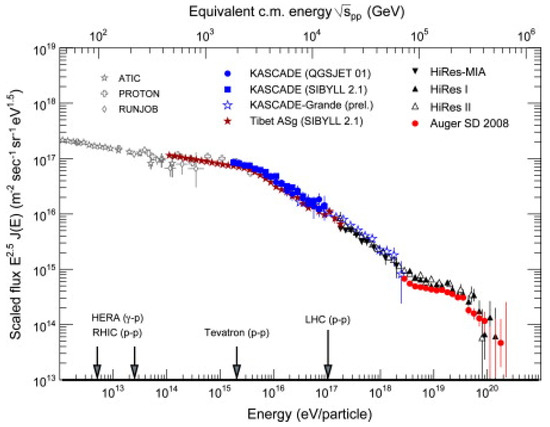 Cosmic radiation is nowadays subdivided into high-energy particles stemming from the sun, mostly protons, which are especially emitted in solar eruptions, and high-energy particles stemming from the solar system or from outside of it. The so-called primary cosmic rays, which are produced directly through processes in space, mostly consist of protons (~89%), alpha particles (~9%), and other bare nuclei of atoms (~1%), as well as a few solitary electrons (i.e., beta particles, ~1%), that is, positively or negatively charged particles with particle rest masses mostly in the range of 938 MeV/c² (proton) to 3727 MeV/c² (alpha particle); while the secondary cosmic rays, produced by collisions of primary cosmic rays with the atmosphere or with spacecraft or tissue, include many more different particles, such as muons, pions, neutrinos, and neutrons, but also protons and alpha particles, as well as X-rays [8]. The energy spectrum of all cosmic-ray particles is shown in Figure 1 for higher energies, as measured by different experiments [9]. Usually, energies up to 1020 eV/particle can be expected, with the largest particle flux at lower energies and a maximum around 10²–10³ MeV/nucleon [8]. Cosmic rays with high atomic number and energy, also called HZE (High Z and Energy) ions, make up only approximately 1% of the galactic cosmic rays, but due to their high energy and the high charge of these ions, they are as dangerous as the much more frequently occurring protons [10,11]. While cosmic radiation is deflected by the Earth’s magnetic shield so that very high-energy particles only scarcely reach the ground [12], this is naturally not the case during space travel.