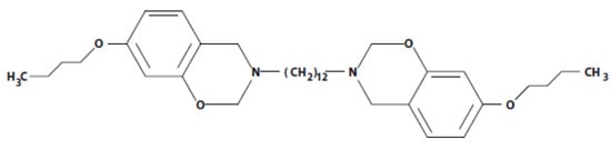 Another new resin was suggested by Iguchi et al., who developed a hydrogen-rich benzoxazine resin, in this way supporting the shielding properties of the pure UHMWPE [52]. For this, they developed different bifunctional benzoxazines from meta-substituted alkoxy phenols and diamines with varying hydrocarbon chain lengths. Using differential scanning calorimetry (DSC) and thermogravimetric analysis (TGA), they found an influence of the diamine chain length on the reactivity of the developed benzoxazines, with larger chain lengths leading to an increase of the polymerization temperature and decrease of the thermal stability. The optimum resin, depicted in Figure 2 as a monomer, was shown to have much higher shielding properties than epoxy using NASA’s On-Line Tool for the Assessment of Radiation in Space (OLTARIS), making this UHMWPE/benzoxazine composite favorable in comparison with common epoxy.