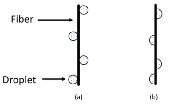Water droplet adhesion on hydrophobic (a) and hydrophilic (b) fiber.