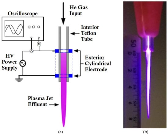 - Johnson, V.S.; Zhu, W.; Wang, R.; Re, J.L.; Sivaram, S.; Mahoney, J.; Lopez, J.L. A Cold Atmospheric-Pressure Helium Plasma Generated in Flexible Tubing. IEEE 2011, 39, 2360–2361. [Google Scholar] [CrossRef]