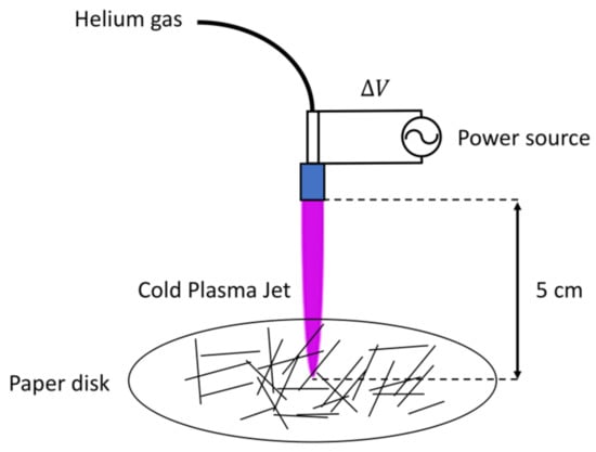 Two fiber types were used in this study: PP and PV. The PP and PV fibers measured 2.5 and 1 cm in length, respectively. Both fiber types were plasma treated at different time intervals. The fibers were placed on a 22.5 cm diameter cardboard disk in a single layer. The disk was then moved around in a random fashion under the action of a stationary atmospheric air room temperature cold plasma jet for a measured time interval. Fibers were held approximately 5 cm from the plasma jet effluent during treatment. The treatment process is shown in Figure 3. Fibers were subjected to the cold plasma jet treatment for 4 different time intervals: 0 s, 30 s, 60 s, and 120 s.