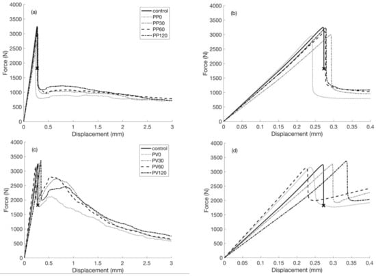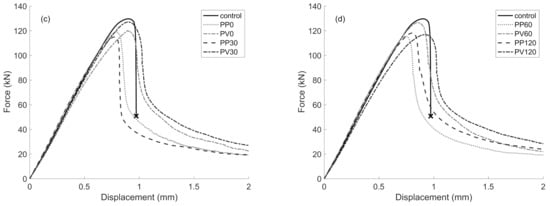 Force-displacement curves for all PV specimens tested in compression at (a) 0 s of treatment time, (b) 30 s of treatment time, (c) 60 s of treatment time, and (d) 120 s of treatment time.