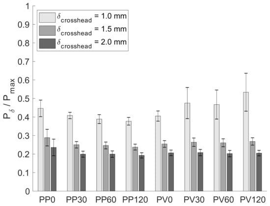 Figure 6 shows the load capacity of all compressive specimens at selected displacements of 1, 1.5, and 2 mm relative to the peak load (Pδ/Pmax). It was observed that, at 1.0 and 1.5 mm of crosshead displacement, the untreated PP fiber specimens had an increased post-peak load-carrying capacity when compared to the treated fiber specimens. For the PV specimens, the PV120 exhibited the highest post-peak load-carrying capacity when compared to the other sets. However, the difference in post-peak behavior becomes less pronounced at crosshead displacements greater than 1.0 mm, with all systems having similar Pδ/Pmax. The PV compression tests exhibited variable displacements at the established peak load, so the post-peak behavior was not subject to the same degree of comparison as the PP fiber specimen sets. The effects of plasma treatment on compressive specimens are more difficult to evaluate in terms of load response due to the various stress states experienced by a fiber within a compressive specimen. Because the failure is not dominated primarily by the progression of tensile failure as is the case in most flexural specimens, the effect of plasma treatment is not as pronounced as in flexural specimens discussed in the next section. Therefore, these preliminary results do not indicate that cold plasma treatment of fibers will provide a benefit to the compression performance of fiber-reinforced composites.