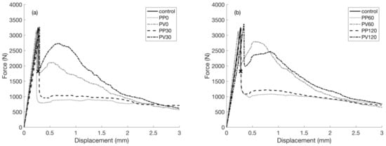 Force–displacement plots comparing flexural PP and PV fiber specimens at 0 and 30 s (a) and 60 and 120 s (seconds) (b).