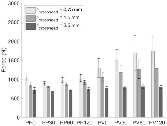 Figure 9 shows a summary of results for the residual load capacity (N) at the selected displacements of 0.75, 1.5 and 2.5 mm. This bar graph shows data for all flexure specimens examined and provides visual distinction between the residual load capacities of each specimen. A positive relationship between treatment and load response can be clearly seen in the PP specimens for treatment times of 0.75 and 1.5 mm of crosshead displacement. At each increase in treatment time, the load response at 0.75 and 1.5 mm increases. As the crosshead displacement reaches higher values, the relationship is less distinguished for PP specimens. For the PV specimens, at 0.75 and 1.5 mm of crosshead displacement, all specimens exhibited an increase in post-peak load capacity when compared to untreated fibers. At greater displacements, the differences in the results were not as significant.