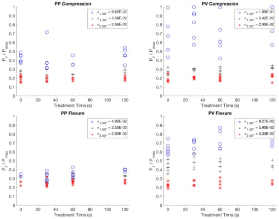 Figure 10 shows scatter plots of Pδ/Pmax vs. treatment time for each specimen type. The standard deviation of Pδ/Pmax values at various displacement increments, is presented for all specimens considered in the dataset. Loading curves were considered outliers by means of graphical data selection if the loading curves exhibited poor specimen seating or non-uniformity with the rest of the data.