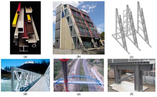 Use of FRP in Structural Engineering (a) Standard pultruded FRP shapes [4,5,6]; (b) GFRP Eyecatcher Building Basel, Switzerland, 1998 [9,17]; (c) Eyecatcher Building-three frame detail [17]; (d) Pontresina truss bridge, Switzerland, 1997 [17,18]; (e) 38 m span Lleida footbridge, Spain, 2004 (Courtesy Fiberline [4]); (f) GFRP platform with bolted joints (image by Jawed Qureshi with permission from Access Design and Engineering Telford UK).