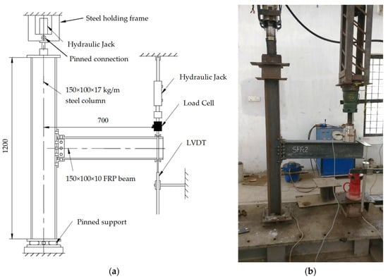 The testing uses a single-sided beam-to-column joint sub-assembly, as shown in Figure 2a. It represents exterior beam-to-column joints in a frame. The beam shape is 150 × 100 × 10 mm pultruded FRP wide-flange section, while the column is an ISWB 150 mm × 100 mm × 17 kg/m steel section. The main reason for using steel column in place of FRP is to avoid the tensile tearing failure in the column. This failure happens when the cleat material is steel and column material FRP. Since steel cleats do not deform under bending action, the failure is transferred to the FRP column. This is followed by large outward flexural deformation in the flanges of FRP column. The tensile tearing failure with outward flexural deformation of FRP columns flanges have been observed previously in [12,14,15]. The failure of a primary load carrying element (column) through tensile tearing of flanges could potentially be disastrous for FRP structures. As FRP cleats crack under prying action, fabricators normally prefer to use steel cleats, rather than FRP, to prevent moisture ingress in the joints for their durability performance [26].